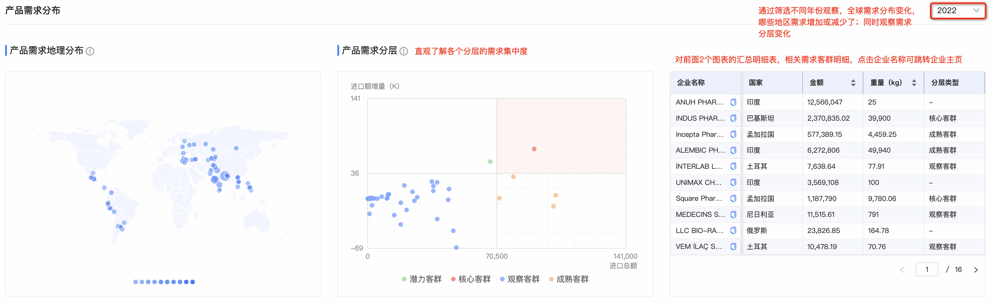 ● 产品需求分层图:k8凯发国际数据通将需求客群按照进口额增量和总额进行分层,划分为潜力、观察、成熟和核心四个层级。分层有助于用户快速锁定目标客户群体。标题旁附需求分层的解读,能让用户更直观、快速理解每个层级的特征,能够更快速的识别目标客群。